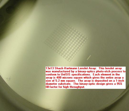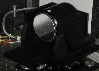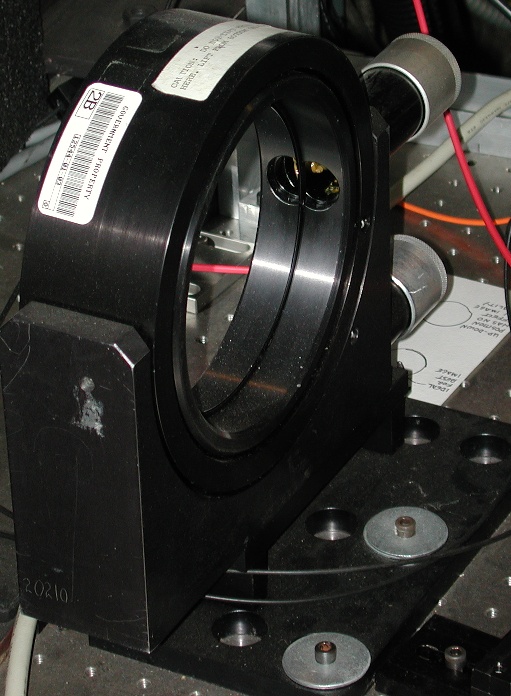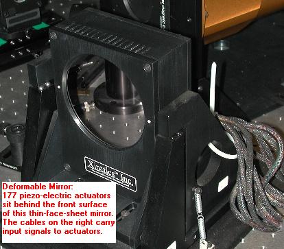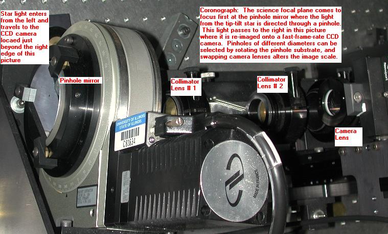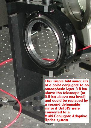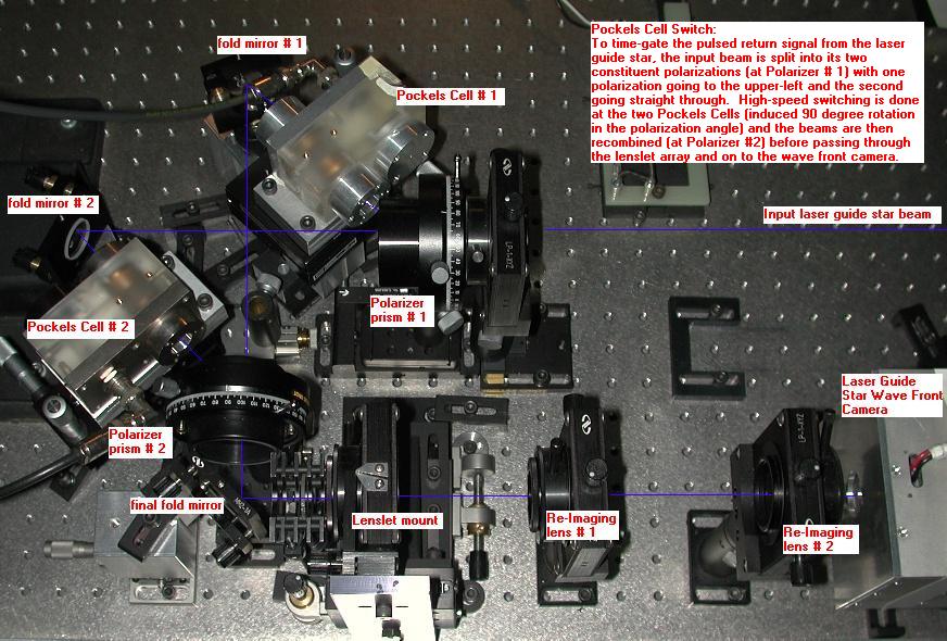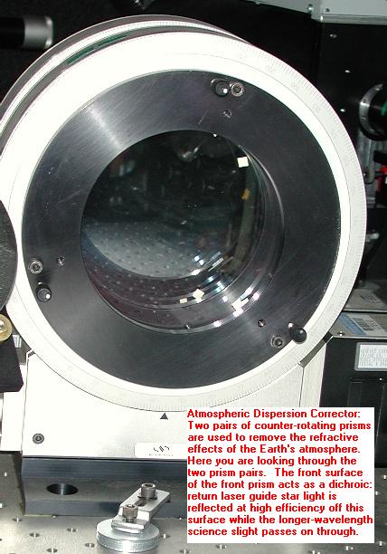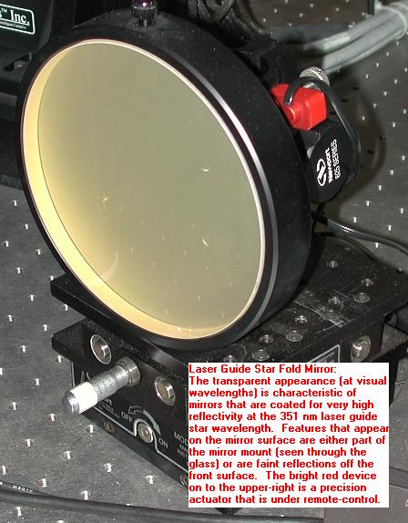 An angle was selected for this photograph to show most system components along the path of the natural star light, so the path followed by the return laser light is more obscured. The return path of the laser guide star light is identical to that of the natural star light from components 1 to 5, with 5 being the ADC = Atmospheric Dispersion Corrector. At point 5, the 351nm laser light hits the front surface of the ADC (the ADC has a dichroic coating on its front surface) and is reflected to the lower left in this picture to 10. Laser Guide Star Fold Mirror. The fold mirror sends the laser return to the upper right (under the raised auxiliary optics table) to 11. Pockels Cell Switch where the beam is reversed in direction, passes through the lenslet array and enters 12. Laser Guide Star Wave Front Camera.