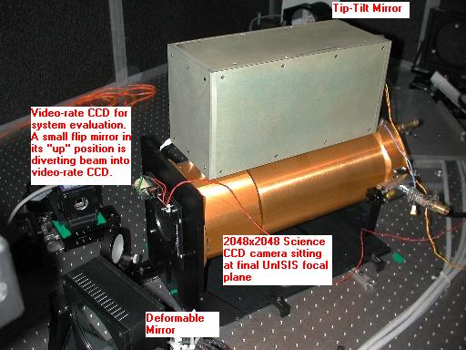The main optics bench of UnISIS is very open, and system components can be repositioned easily for test purposes. This design is possible because the optics bench sits at the Coude focus where space is not an issue. The optics bench itself is 5x16 feet. The picture below displays the full width of the system but excludes both ends of its 16-foot length.