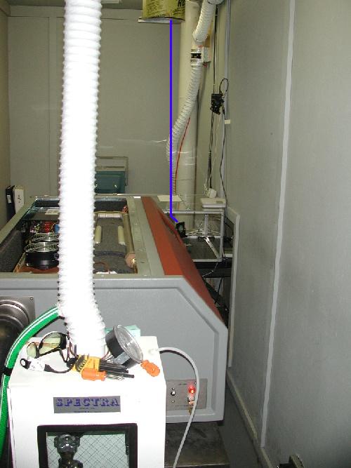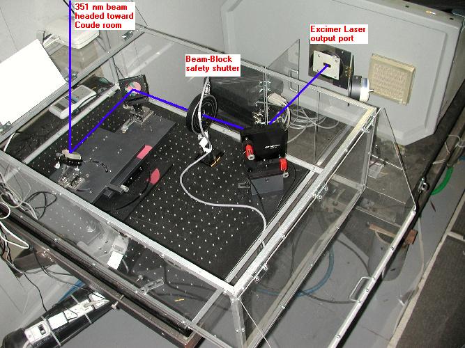 The Excimer laser is shown in the picture below. The cabinet in the foreground (with the vent pipe running to the ceiling) holds the fluorine gas bottle, and the laser itself is next in line. The output laser beam emerges from the far side of the laser cabinet, reflects off a set of beam-steering mirrors, and eventually is sent through a portal in the ceiling to the beam combining optics that are located in the Coude Room some 10 meters overhead.